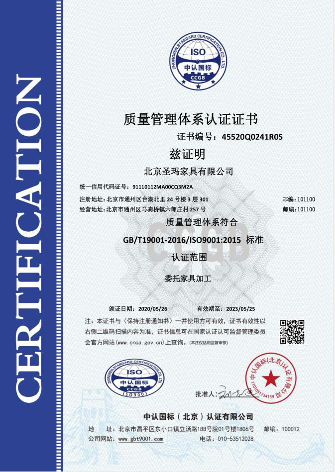 北京圣瑪家具有限公司是以設計研發、生產、銷售、服務為一體的專業化辦公家具制 造企業;主要經營辦公家具、校園家具、實驗室家具、酒店套房、全屋定制類等家具。 公司成立于 2017 年,生產基地位于天津市蘆臺經濟開發區華澳盛世家具有限公司院 內,占地面積約 10000 平米,擁有員工 100 人左右,其中高級技術人員達 15%以上。 公司采用了南興、先達系列等先進生產設備,建立專業流水線,具備先進的生產及加 工能力。公司設有專業的產品設計部、運營部、質檢部等,提供專業的 CAD 平面圖、立面 圖級效果設計圖紙。 使用優質的進口原材料及配件;嚴把進貨渠道,所用材料符合國家環保標準要求。款 式上依據人體工程學原理,追求多樣化的設計風格。按照 “ISO900/ISO14001 族標準” 的 要求,嚴格控制每一個環節。 并本著“以質量求發展,向管理要效益,顧客滿意為焦點,持續改進,共筑偉業”的 宗旨方
